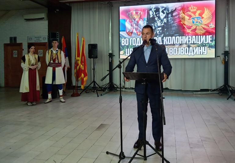"Колонизација Црногораца у Војводину је један од најзначајнијих историјских догађаја у новијој историји нашег народа. Данас се сећамо, захваљујемо и славимо. Сећамо се времена великих промена, захваљујемо онима који су тада стварали нове домове и градили темеље живота, славимо наслеђе које су нам оставили. После Другог светског рата пореко 1.000 породица из разних крајева Црне Горе, Лике, Кордуна, Босне и Херцеговине, Далмације и других делова некадашње државе, дошли су у ову равницу. Дошли су са надом али и са страхом, поносом али и са тугом за огњиштима које су морали да напуштају. Дошли су у земљу плодних њива, али празних кућа, у крај подједнако пун могућности и изазова. Они који су дошли нису донијели много, најчешће само вољу, руке спремне да раде и срце пуно вере у боље сутра. Градили су куће, орали земљу, подизали породице, отварали школе и домове културе. Њихова жртва и упорност створила је темеље заједнице у којој данас живимо. Зато смо данас овде да се захвалимо нашим прецима, колонистима, пионирима живота у овој средини. Они нису само населили равницу они су је оживели и оплеменили. Наша обавеза је да чувамо наслеђе, негујемо вредности које су нам оставили, а то су поштење, рад, солидарност, љубав према земљи и комшији", рекао је Симовић.